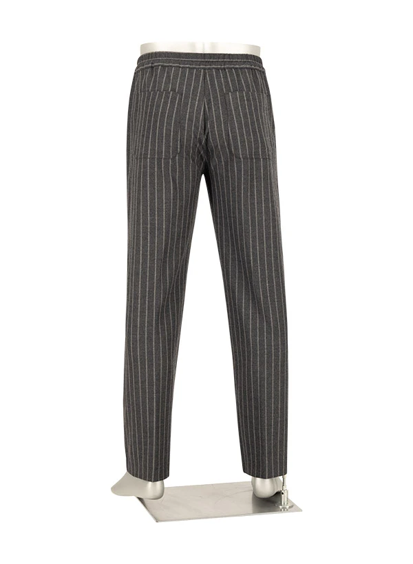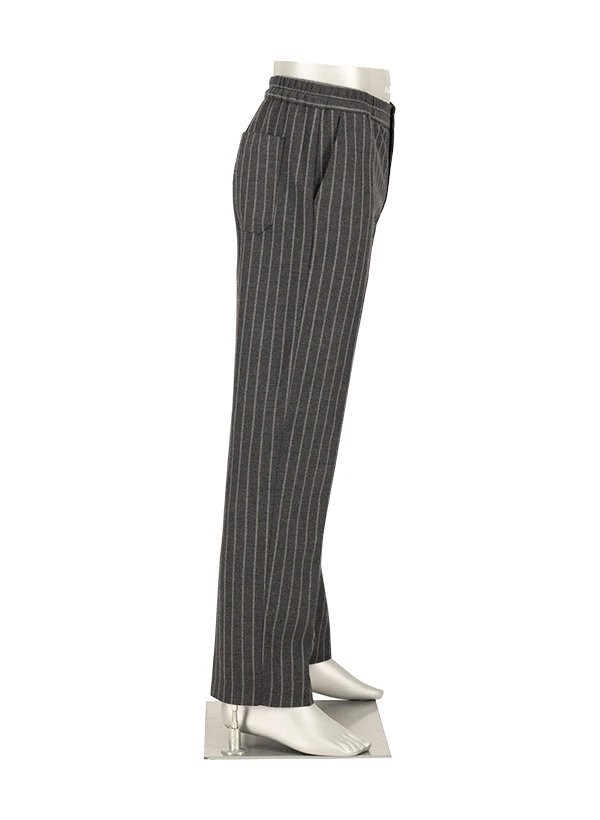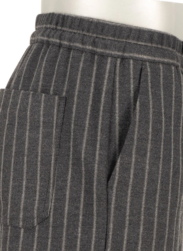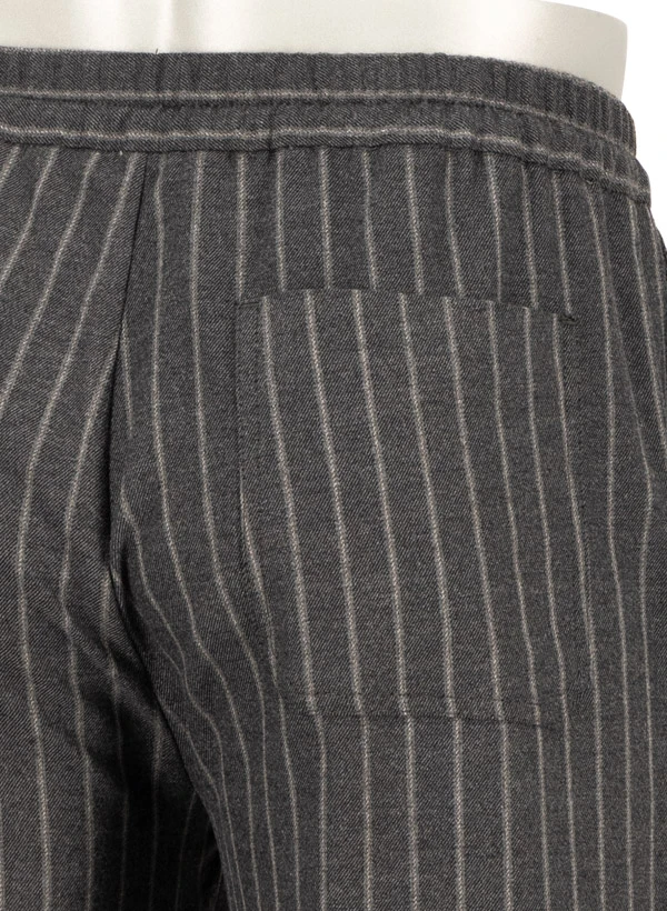 Das dezente Streifenmuster auf dunkelgrauem Flanell verleiht dieser Hose eine elegante Tiefe, die sowohl im Büro als auch in der Freizeit überzeugt. Der weiche Flanellstoff aus Polyester-Viskose-Mix schmeichelt der Haut und bietet dank Elasthan-Anteil angenehme Bewegungsfreiheit. Die Wide Fit Passform mit Elastikbund und regulierbarem Tunnelzug vereint lässigen Komfort mit urbanem Stil. Aufgesetzte Gesäßtaschen und seitliche Einschubtaschen runden die durchdachte Ausstattung ab.