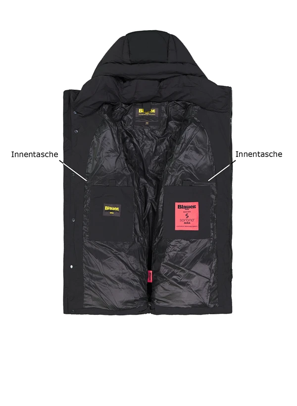 Die tiefschwarze Steppjacke zeigt sich mit markanter Raglanlinie und einer Reißverschlusstasche am linken Oberarm für urbanen Tech-Look. Das wasserabweisende Polyamid-Gewebe schützt zuverlässig vor Nieselregen, während die nachhaltige Sorona-Wattierung wohlige Wärme ohne Gewicht spendet. Die angeschnittene Kapuze mit verstellbarem Gummizug und die doppelte Verschlusslösung aus Reißverschluss plus Druckknopfleiste machen sie zum vielseitigen Begleiter für wechselhafte Herbsttage. Seitliche Reißverschlusstaschen und praktische Innentaschen bieten Stauraum für Smartphone, Schlüssel und Geldbörse.