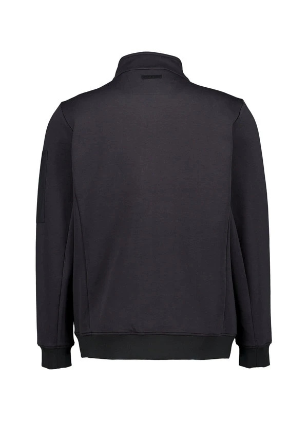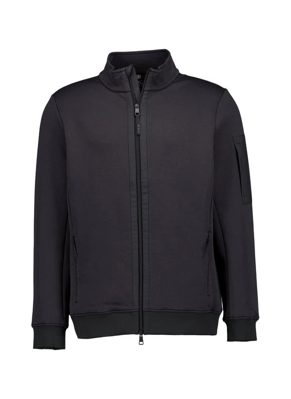 Die schwarze Sweatjacke zeigt sich mit nahtfeinen Reißverschlusstaschen an den Seiten und einer zusätzlichen Ärmeltasche für urbane Funktionalität. Der Baumwoll-Stretch-Mix schmiegt sich weich an den Körper und behält durch den Elasthan-Anteil dauerhaft seine Form. Für den modernen Alltag zwischen Büro und Freizeit bietet sie mit Stehkragen und durchgehendem Reißverschluss flexible Tragemöglichkeiten. Die Rippenstrickbündchen an Ärmeln und Saum sorgen für einen sauberen Abschluss und optimale Passform.