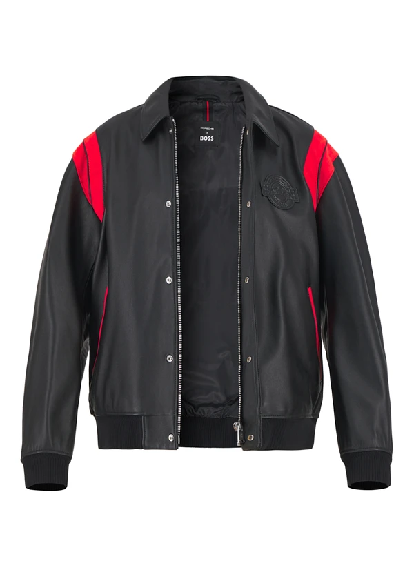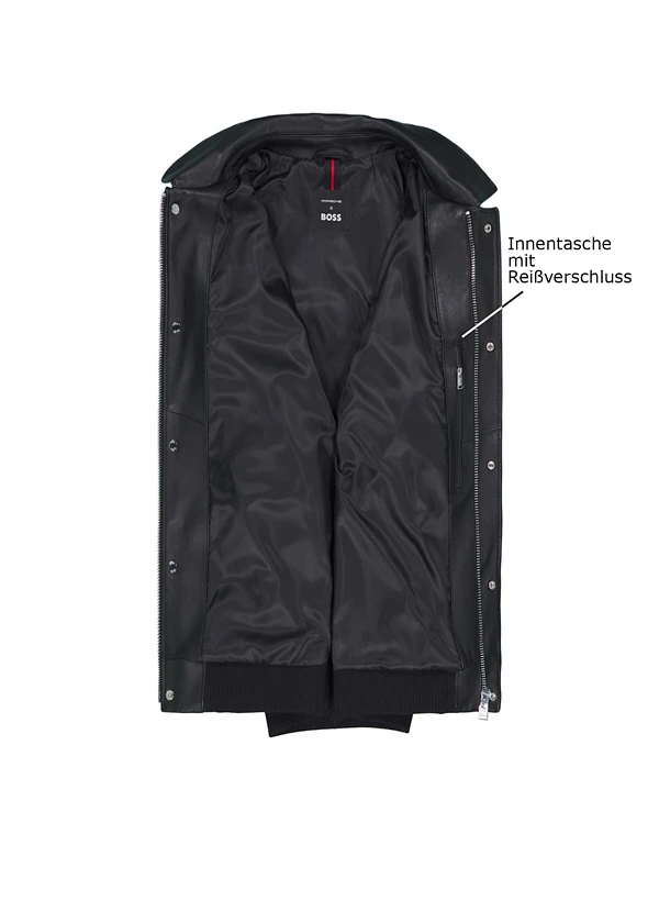 Das schwarze Lammleder zeigt sich in einer kraftvollen Silhouette mit markanten Kontrastnähten an den Paspeltaschen. Die butterweiche Nappa-Qualität schmiegt sich geschmeidig an den Körper und entwickelt mit der Zeit eine individuelle Patina. Der Blouson verbindet Motorsport-DNA mit urbanem Understatement – perfekt für den Weg vom Büro zur Abendveranstaltung. Rippenbündchen an Ärmeln und Saum sowie die verdeckte Druckknopfblende unterstreichen die cleane Optik.