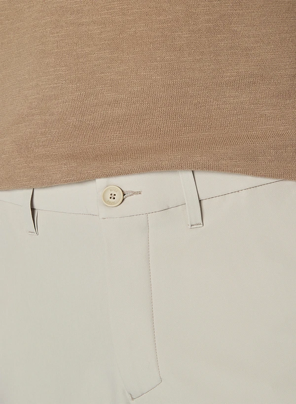 Das helle Beige dieser Hose wirkt modern und vielseitig, während der technische Doubleface Jersey durch seine glatte Außenseite und weiche Innenseite überzeugt. Die wasserabweisende Oberfläche perlt Feuchtigkeit ab, während das schnelltrocknende Material aus Polyester und Elasthan für dauerhaften Komfort und Bewegungsfreiheit sorgt. Der Slim Fit sitzt körpernah ohne einzuengen – ideal für urbane Athleisure-Looks zwischen Sport und Stadt. Seitliche Eingrifftaschen und verdeckt geknöpfte Gesäßtaschen bieten praktischen Stauraum, der weitenregulierbare Tunnelzug am Innenbund ermöglicht eine individuelle Passform.