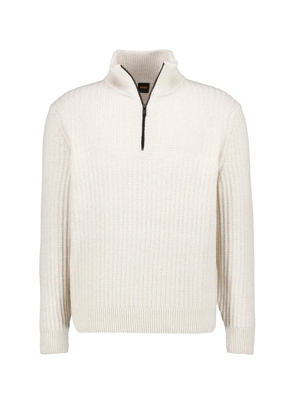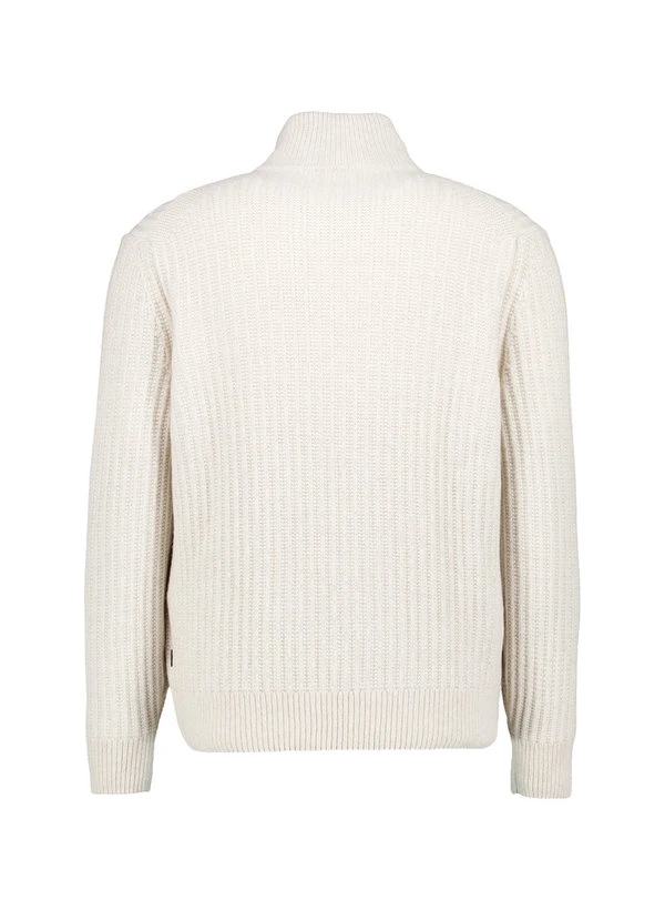 Der cremige Beigeton und der kontrastreiche Reißverschluss am Stehkragen verleihen diesem Troyer eine moderne Note. Das Rippenstrick-Gewebe aus recycelter Wolle und Schurwolle fühlt sich warm und griffig an – ideal für kühlere Tage ohne schweres Tragegefühl. Die strukturierte Oberfläche macht den Pullover zum vielseitigen Begleiter zwischen Büro und Wochenende. Elastische Rippenstrickbündchen an Ärmeln und Saum sorgen für optimalen Sitz und Bewegungsfreiheit.