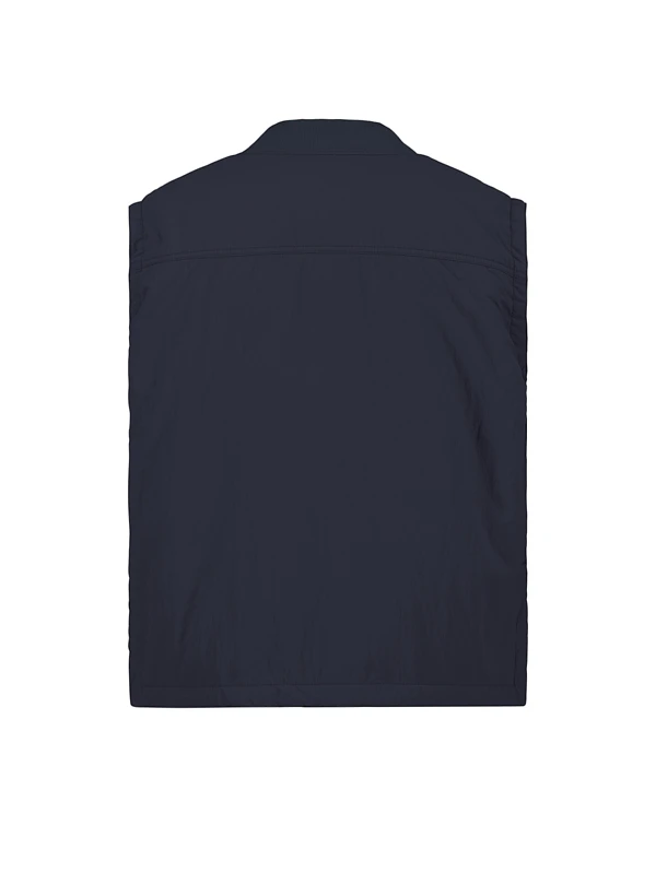 Das satte Dunkelblau verleiht dieser leicht wattierten Weste urbane Eleganz mit sportivem Twist. Das recycelte Polyamid fühlt sich federleicht an und bietet dank der dezenten Wattierung genau die richtige Wärmeisolierung für die Übergangszeit. Die verdeckte Druckknopfleiste und der Collegekragen aus Rippenstrick sorgen für einen cleanen Look, während die seitlichen Reißverschlusstaschen praktischen Stauraum bieten. Raffinierte Details wie die seitlichen Schlitze mit verdeckten Druckknöpfen ermöglichen mehr Bewegungsfreiheit und unterstreichen den durchdachten Schnitt.