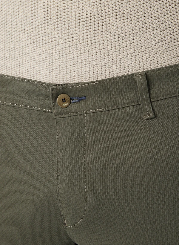 Die olivgrüne Chino zeigt eine lebendige Webstruktur, die dem klassischen Schnitt moderne Tiefe verleiht. Der hochwertige Baumwoll-Stretch schmiegt sich angenehm an und bietet durch den Elasthan-Anteil volle Bewegungsfreiheit für den ganzen Tag. Die Regular Fit Passform sitzt bequem ohne aufzutragen – ideal für Büro, Stadtbummel oder entspannte Abende. Seitliche Eingrifftaschen, eine Münztasche und geknöpfte Paspeltaschen hinten runden die durchdachte Ausstattung ab.