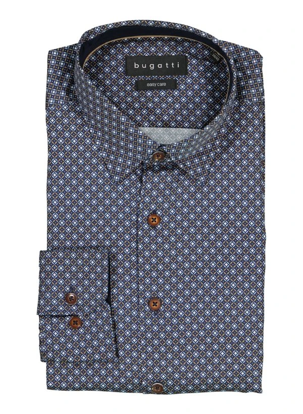 Das marineblaue Grundgewebe zeigt ein feines grafisches Muster, das dem Hemd urbane Eleganz verleiht. Die reine Baumwolle fühlt sich kühl auf der Haut an und transportiert Feuchtigkeit zuverlässig nach außen. Mit seinem Kentkragen und der italienischen Knopfleiste passt es sowohl ins Büro als auch zu entspannten Abendveranstaltungen. Kontrastmaterial an Manschetten, Kragensteg und Knopfleisten-Untertritt setzt dezente Akzente für den aufmerksamen Betrachter.