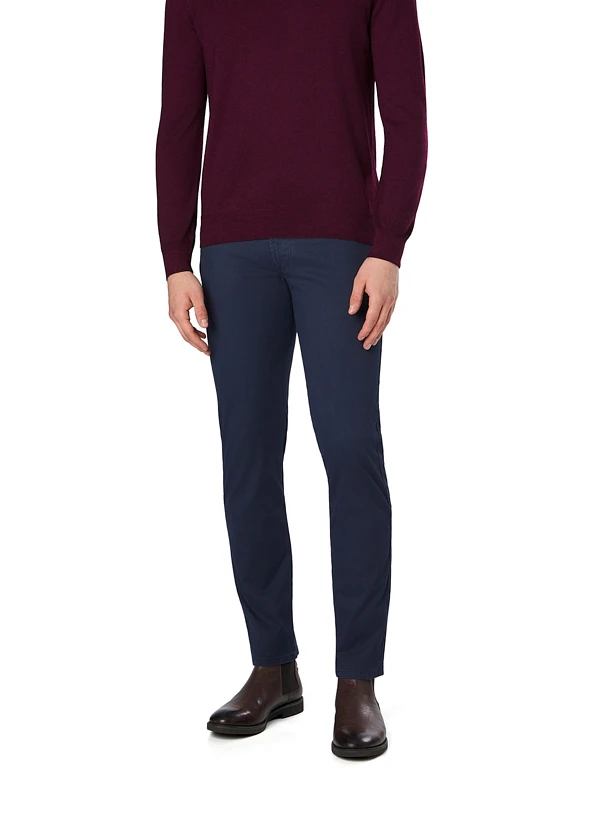 Die blau melierte Oberfläche erhält durch die spezielle Peach-Veredelung eine samtweiche, fast pfirsichähnliche Haptik. Der hochelastische Baumwoll-Stretch mit T400-Faser sorgt für dauerhaften Formerhalt und passt sich jeder Bewegung an – ideal für lange Tage im Büro oder unterwegs. Im klassischen Five-Pocket-Stil geschnitten, verbindet diese Hose urbane Lässigkeit mit gepflegter Optik. Die Fußweite von 34 cm bei Größe 34/32 schafft eine moderne, schlanke Silhouette ohne einzuengen.