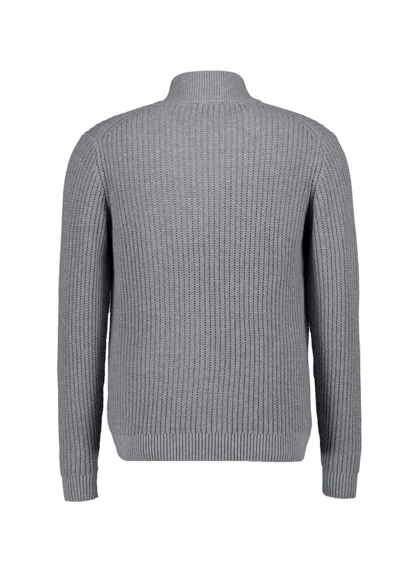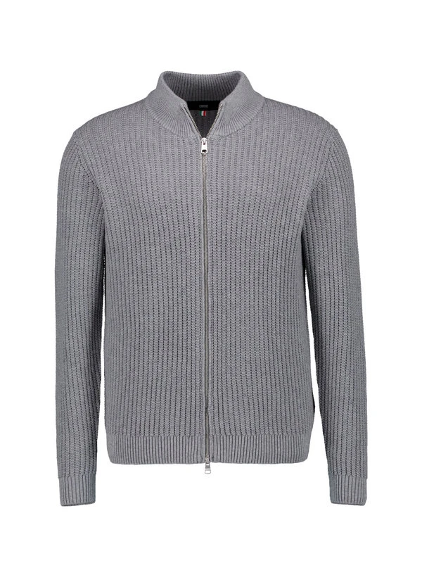Die strukturierte Oberfläche dieses Cardigans zeigt sich in einem eleganten Hellgrau, das durch die besondere Strickführung eine lebendige Tiefe erhält. Das hochwertige Mischgewebe aus Baumwolle und Wolle fühlt sich angenehm weich an und reguliert die Körpertemperatur optimal. Der praktische Zwei-Wege-Reißverschluss ermöglicht flexible Tragevarianten, während der Stehkragen für urbane Eleganz sorgt. Die Rückenlänge von etwa 70 cm bei Größe M unterstreicht die moderne, körpernahe Passform.