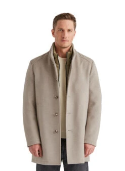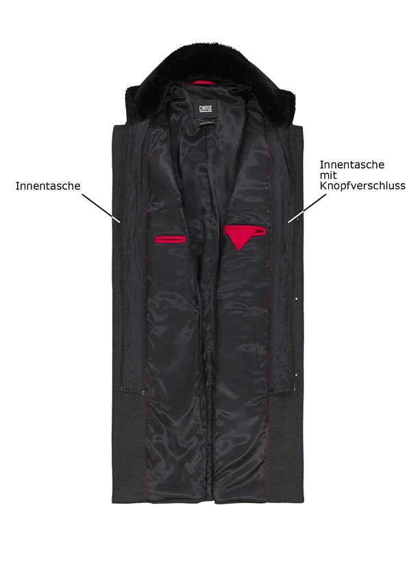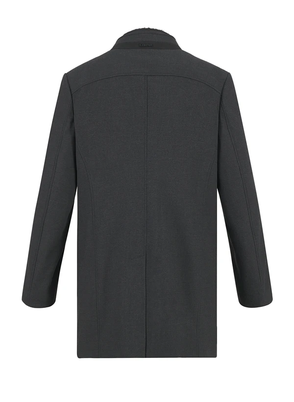 Der anthrazitgraue Wollmantel Ciarsenal überzeugt durch seinen abnehmbaren Steppeinsatz mit Kunstfellkragen – ein durchdachtes 2-in-1-Konzept für wechselhafte Temperaturen. Das hochwertige Wollmischgewebe aus Polyester, Viskose und Elasthan fühlt sich geschmeidig an und bietet durch den Elasthananteil angenehme Bewegungsfreiheit. Die klare Silhouette mit Stehkragen und verdeckter Knopfleiste wirkt urban und zeitlos elegant. Praktische Details wie die Brusttasche mit Reißverschluss und die Innentasche bieten sicheren Stauraum für Smartphone und Geldbörse.
