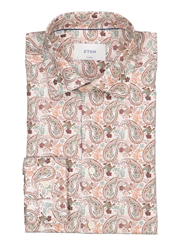 Das klassische Paisley-Dessin zeigt sich hier in nuancierten Brauntönen und verleiht dem Hemd eine dezente Eleganz mit Tiefe. Die Mischung aus Baumwolle und nachhaltigem Lyocell fühlt sich seidig-glatt an und reguliert Feuchtigkeit besonders effektiv. Im Büro wirkt das Muster distinguiert unter dem Sakko, am Wochenende lässig zur Chino. Die weitenverstellbare Kombimanschette und der Kentkragen unterstreichen die klassische Linie.