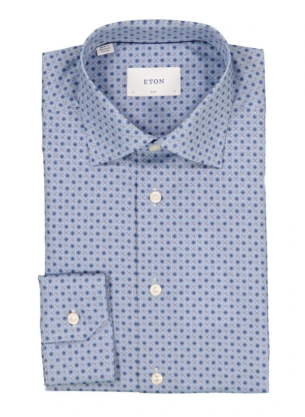 Das florale Muster auf blauem Grund verleiht diesem Hemd eine lebendige, moderne Note ohne aufdringlich zu wirken. Die reine Baumwolle fühlt sich weich an und reguliert das Körperklima – ideal für lange Tage im Büro oder entspannte Abende. Mit seiner schlanken Silhouette und dem klassischen Kentkragen passt es sowohl zu Business-Casual als auch zu urbanen Freizeitlooks. Die italienische Knopfleiste mit ETON-Perlmuttknöpfen und die weitenverstellbare Kombimanschette zeigen die Liebe zum Detail.