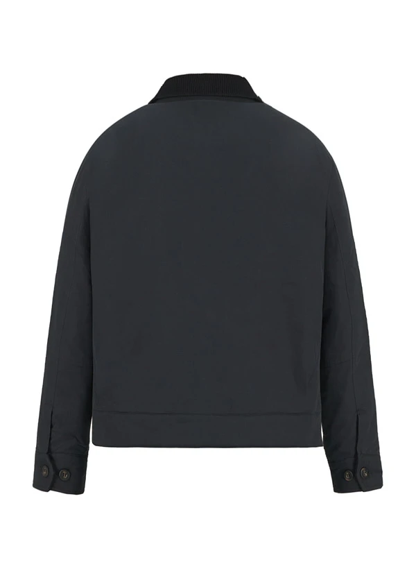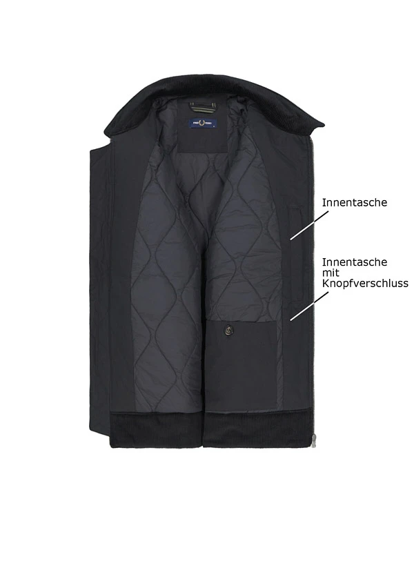 Die schwarze Baumwolljacke zeigt sich mit markanten Cord-Details am Umlegekragen und schafft so einen spannenden Material-Mix. Das wattierte Steppfutter aus recyceltem Polyester wärmt zuverlässig, während der Baumwoll-Außenstoff mit 22% recyceltem Polyester-Anteil robust und pflegeleicht bleibt. Der Zwei-Wege-Reißverschluss aus Metall und die geknöpften Seitentaschen unterstreichen den funktionalen Charakter für Stadt und Outdoor. Kontrastmaterial an Manschetten-Innenseite und Saum sowie die weitenverstellbaren Ärmelabschlüsse runden das durchdachte Design ab.