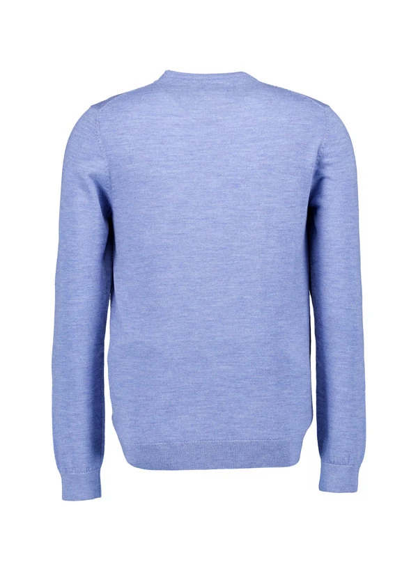 Das kühle Crystalblue dieses Pullovers wirkt edel und zurückhaltend – eine Farbnuance, die sowohl zum grauen Anzug als auch zur dunklen Jeans passt. Die reine Merinowolle fühlt sich weich an, kratzt nicht und reguliert die Körpertemperatur auf natürliche Weise. Der klassische Rundausschnitt und der gerade Schnitt machen ihn zum vielseitigen Begleiter für Business-Casual und entspannte Abende. Der feine Strick zeigt die Qualität des Materials und unterstreicht die schlichte Eleganz.