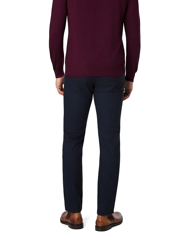 Die dunkelmarine Melierung verleiht dieser Five-Pocket-Hose eine lebendige Tiefe, die sich elegant zwischen Business und Freizeit bewegt. Der hochwertige Baumwollmix mit Viskose-Anteil fühlt sich besonders weich an und bietet durch die Polyester-Beimischung eine hervorragende Formstabilität – ideal für lange Tage im Büro oder auf Reisen. Mit ihrem Modern Fit sitzt die Hose körpernah ohne einzuengen und unterstreicht eine zeitgemäße Silhouette. Die klassische Five-Pocket-Aufteilung bietet praktischen Stauraum, während die Fußweite von 36 cm für einen modernen, schlanken Abschluss sorgt.