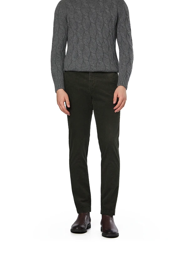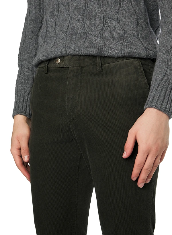 Das satte Jägergrün verleiht dieser Cordhose eine markante Präsenz, die durch die feine Rippenstruktur zusätzlich an Tiefe gewinnt. Der weiche Baumwoll-Elasthan-Mix schmiegt sich angenehm an und bietet durch den Stretch-Anteil optimale Bewegungsfreiheit im Alltag. Mit ihrem Slim Fit und dem verlängerten Bund wirkt die Hose modern und zugleich klassisch – ideal für urbane Herbsttage oder entspannte Business-Casual-Anlässe. Die geknöpften Gesäßtaschen und die kleine Münztasche an der rechten Bundnaht setzen stilvolle Akzente.