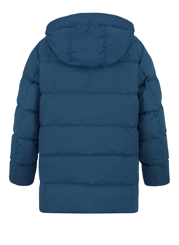 Das tiefe Marineblau verleiht diesem Parka zeitlose Eleganz, während die wasserabweisende Oberfläche aus recyceltem Polyester zuverlässig vor Nässe schützt. Die hochwertige Daunenfüllung (70% Daunen, 30% Federn) wärmt optimal, ohne aufzutragen, und sorgt für ein angenehm leichtes Tragegefühl. Der durchdachte Schnitt mit Zwei-Wege-Reißverschluss ermöglicht flexible Bewegungsfreiheit im urbanen Alltag. Handwärmetaschen auf Brusthöhe und seitliche Taschen mit verdeckt geknöpfter Patte bieten praktischen Stauraum, während innenliegende Rippenstrickbündchen an den Ärmelsäumen für windgeschützten Komfort sorgen.