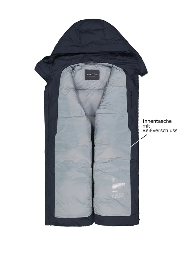 Die tiefe Navy-Färbung verleiht diesem Daunenparka zeitlose Eleganz, während das recycelte Polyester-Außenmaterial moderne Nachhaltigkeit verkörpert. Das wasserabweisende Gewebe schützt zuverlässig vor Nässe, während die hochwertige 70/30 Daunen-Federn-Füllung wohlige Wärme speichert. Der durchdachte Zwei-Wege-Reißverschluss ermöglicht flexible Bewegungsfreiheit beim Sitzen oder Radfahren. Handwärmetaschen auf Brusthöhe und seitliche Taschen mit verdeckten Patten bieten praktischen Stauraum, während innenliegende Rippstrickbündchen an den Ärmeln für windgeschützten Komfort sorgen.