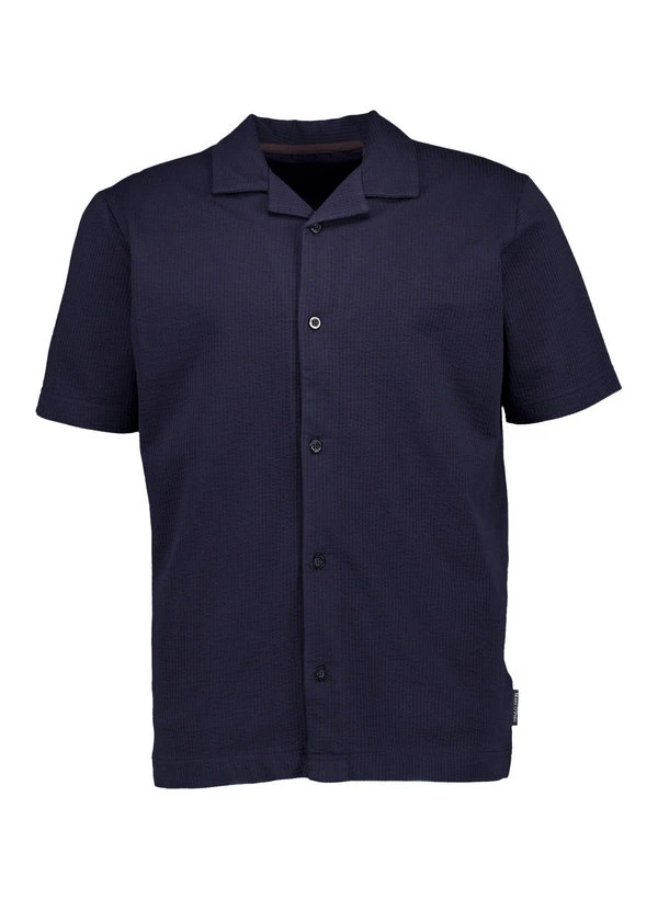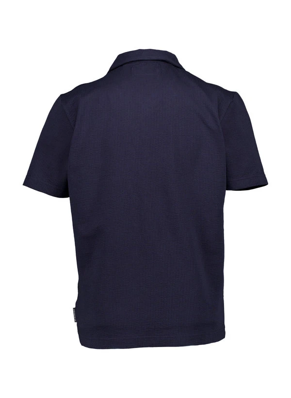 Der markante Bowlingkragen verleiht diesem dunkelblauen Kurzarmhemd eine entspannte Retro-Note. Das strukturierte Seersucker-Gewebe aus Bio-Baumwolle mit Elasthan-Anteil fühlt sich luftig an und liegt dank der wellenartigen Oberfläche nie vollständig auf der Haut auf – ideal für warme Tage. Die italienische Knopfleiste mit kurzem Revers unterstreicht den lässig-eleganten Charakter, während der Regular Fit für bequeme Bewegungsfreiheit sorgt. Die Rückenlänge von 75 cm bei Größe M und die Taillenweite von 116 cm bieten eine moderne, nicht zu enge Passform.