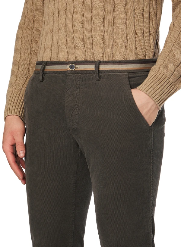 Das samtige Dunkelbraun des Feincords erhält durch farblich abgesetzte Paspeln an den Gesäßtaschen und ein dezentes Zierband am Bund raffinierte Akzente. Der hohe Modalanteil macht das Cordgewebe geschmeidig und sorgt für einen fließenden Fall mit angenehmem Tragekomfort. Die Slim-Fit-Silhouette wirkt modern und urban, ohne dabei die Bewegungsfreiheit einzuschränken. Seitliche Einschubtaschen und geknöpfte Gesäßtaschen runden die durchdachte Ausstattung ab.