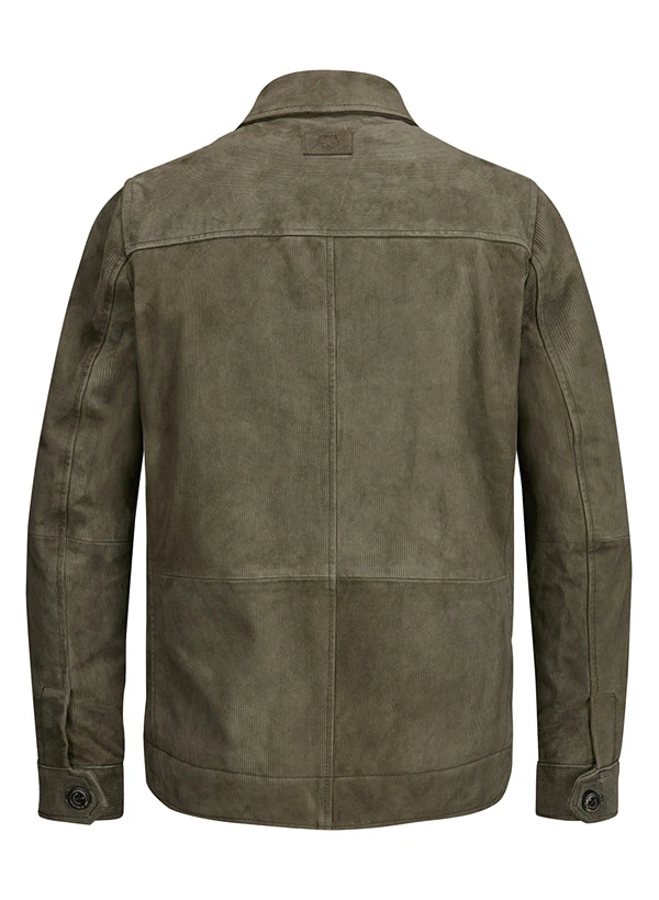 Die dunkelgrüne Oberfläche zeigt eine feine Cord-Struktur, die dem weichen Ziegenvelours eine besondere Textur verleiht. Das hochwertige Leder fühlt sich samtig an und wird durch die wärmende Wattierung zum verlässlichen Begleiter für kühlere Tage. Die entspannte Overshirt-Passform verbindet lässigen Komfort mit der Eleganz eines Hemdjacken-Schnitts. Echthorn-Knöpfe, aufgesetzte Brusttaschen mit doppelt geknöpfter Patte und der klassische Umlegekragen unterstreichen den werkstattgeprägten Charakter.