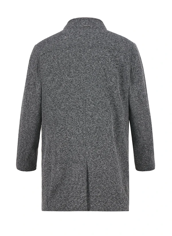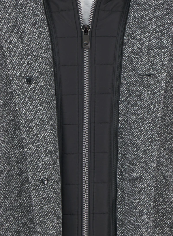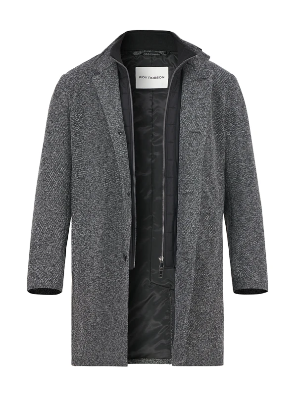 Das dunkelgraue Mikrofaser-Gewebe zeigt eine dezente Melierung, die dem Mantel urbane Eleganz verleiht. Die wattierte Verarbeitung aus recyceltem Polyester wärmt zuverlässig, während der abzipbare Steppeinsatz mit Rippenstrick-Innenkragen für variable Trageanpassung sorgt. Der moderne Stehkragen und die durchdachte Knopfleiste machen ihn zum idealen Begleiter für Business und City. Praktische Details wie die verdeckte Brusttasche mit Reißverschluss und klassische Seitentaschen runden die Funktionalität ab.