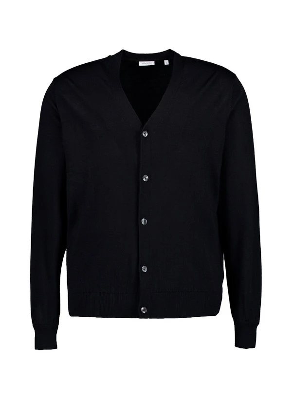 Die tiefschwarze Farbe und die schimmernden Perlmuttknöpfe verleihen diesem Cardigan eine elegante Ausstrahlung. Der feine Wollstrick fühlt sich weich an und reguliert die Körpertemperatur auf natürliche Weise – wärmend ohne zu beschweren. Die klassische Knopfleiste mit Blende und die fein gerippten Bündchen unterstreichen den zeitlosen Business-Casual-Charakter. Bei Größe M misst die Rückenlänge etwa 69 cm, die Brustweite liegt bei komfortablen 116 cm.