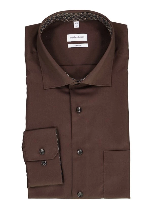 Das herbstliche Dunkelbraun wirkt weich, während die Kontrastmaterialien an Kragensteg und Manschetteninnenseite dezente Akzente setzen. Die reine Baumwolle fühlt sich angenehm kühl an und bleibt dank bügelfreier Ausrüstung den ganzen Tag über glatt – ideal für Vielreisende und alle, die morgens Zeit sparen möchten. Der Comfort Fit bietet entspannte Bewegungsfreiheit für Business und Freizeit gleichermaßen. Die italienische Knopfleiste mit Kentkragen und die weitenverstellbare Sportmanschette unterstreichen die durchdachte Verarbeitung.