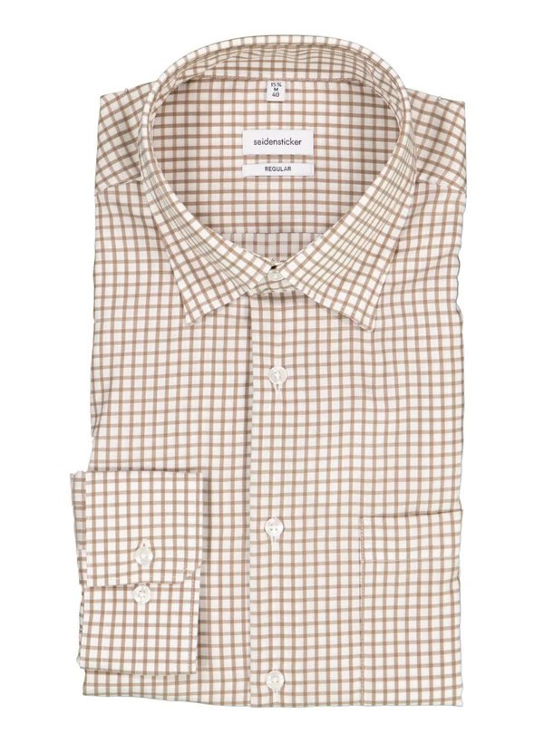Das dezente Gitterkaro in Weiß-Nougat verleiht diesem Hemd eine warme, zurückhaltende Eleganz. Die reine Baumwolle fühlt sich angenehm auf der Haut an und bleibt dank bügelfreier Ausrüstung den ganzen Tag über glatt. Der Button-Under-Kragen wirkt sportlich-modern und passt sowohl ins Büro als auch zur gepflegten Freizeitgarderobe. Die weitenverstellbare Sportmanschette und zwei Bewegungsfalten im Rücken sorgen für optimale Passform und Bewegungsfreiheit.