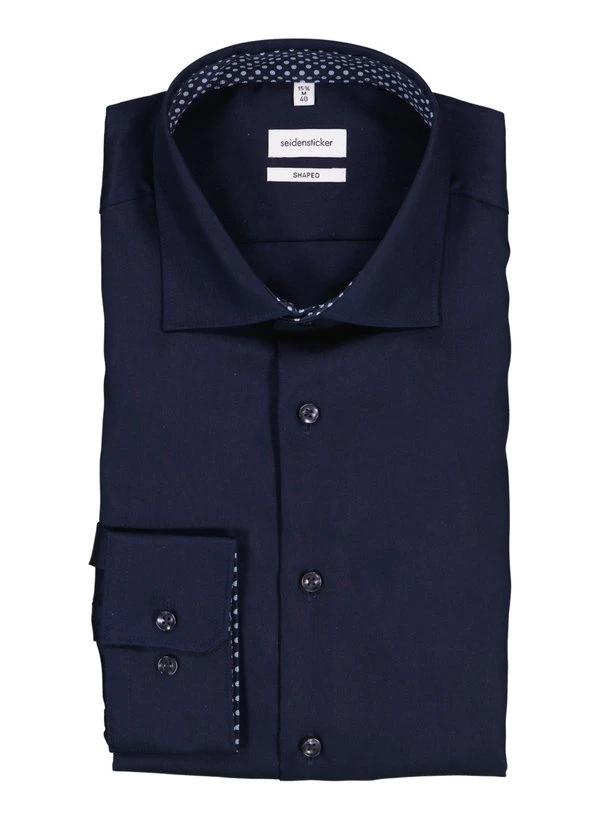 Das tiefe Navy des hochwertigen Baumwoll-Twills erhält durch dezente Kontrastdetails am inneren Kragensteg und der Manschette eine moderne Note. Die dichte Twill-Bindung verleiht dem Stoff eine angenehm glatte Oberfläche mit feinem Glanz, während die reine Baumwolle für atmungsaktiven Tragekomfort sorgt. Die bügelfreie Ausrüstung macht das Hemd zum verlässlichen Begleiter für Business und gehobene Anlässe. Der Shaped Fit mit Rückenabnähern betont die Silhouette ohne einzuengen, die weitenverstellbare Sportmanschette ermöglicht individuellen Sitz.