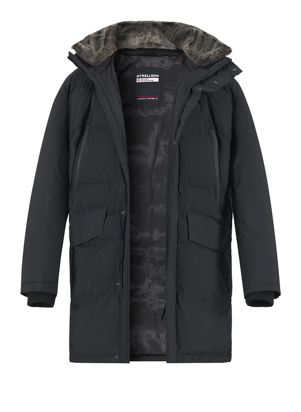 Der schwarze Parka kombiniert urbane Eleganz mit durchdachten Details wie den getapten Brusttaschen und dem abnehmbaren Kunstfellbesatz am Stehkragen. Die recycelte Polyester-Wattierung hält zuverlässig warm, während das wasserdichte Obermaterial vor Wind und Wetter schützt. Mit seiner Länge von 89 cm und den praktischen 2-in-1 Taschen meistert er sowohl den Geschäftstermin als auch winterliche Stadttouren. Die Rippenstrickbündchen an den Ärmeln und der Zwei-Wege-Reißverschluss mit breiter Druckknopfblende unterstreichen die funktionale Raffinesse. Strellson zeigt mit dem Modell Ambience einmal mehr, wie Schweizer Präzision und urbanes Design eine perfekte Symbiose eingehen – technisch ausgereift und stilvoll zugleich. Für die kalte Jahreszeit ist dieser Parka mit seiner hochwertigen Wattierung und dem wind- und wasserdichten Material ein verlässlicher Begleiter.