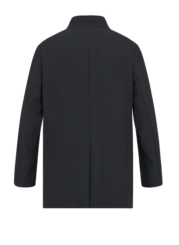 Die tiefschwarze Mikrofaser zeigt sich in mattem Finish und bietet durch den Elasthan-Anteil eine bemerkenswerte Bewegungsfreiheit. Das winddichte und wasserdichte Material schützt zuverlässig vor Wetterkapriolen, während die elastische Struktur für angenehmen Tragekomfort sorgt – ideal für lange Arbeitstage und spontane Wetterumschwünge. Der cleane Schnitt mit Stehkragen und verdeckter Knopfleiste unterstreicht die urbane Eleganz, während praktische Details wie seitliche Einschubtaschen den Alltagsnutzen erhöhen. Die Rückenlänge von 84 cm bei Größe 50 bietet optimale Bedeckung, der Mittelschlitz hinten gewährleistet Bewegungsfreiheit beim Gehen.