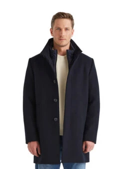 Der markante Stehkragen und die durchgehende Knopfleiste verleihen diesem beigen Mantel eine moderne, urbane Silhouette. Die leichte Doubleface-Qualität aus Polyester, Polyamid und Wolle fühlt sich angenehm weich an und bietet trotz des geringen Gewichts zuverlässigen Schutz vor kühlem Wind. Mit seiner klaren Schnittführung und der halbgefütterten Verarbeitung passt er perfekt zum Business-Look oder zur gehobenen Freizeitgarderobe. Die praktischen Seitentaschen und der Gehschlitz im Rücken sorgen für Bewegungsfreiheit und Funktionalität im Alltag.