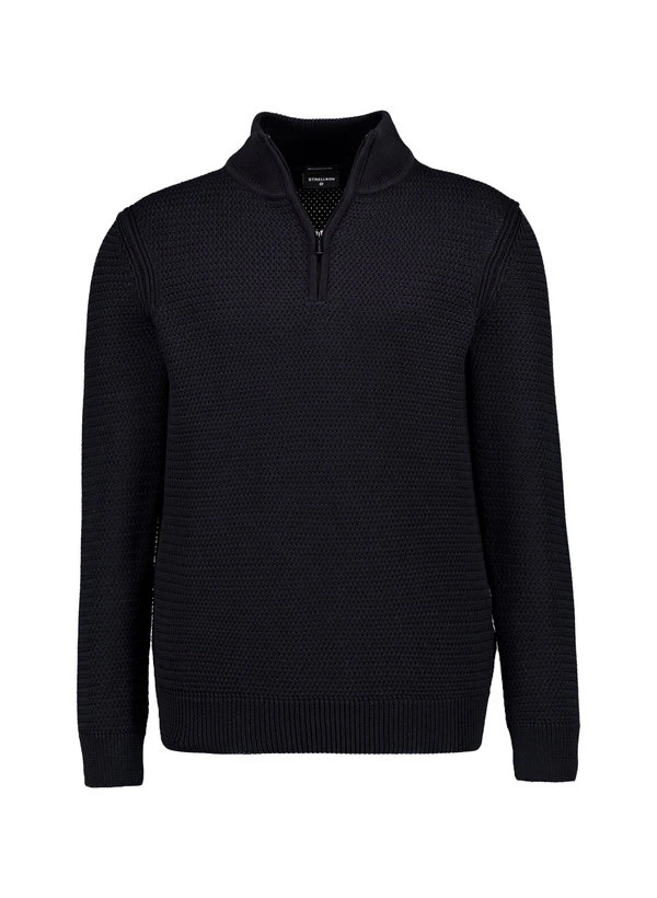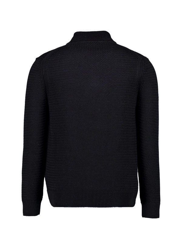 Die markante Strickstruktur verleiht diesem schwarzen Troyer eine besondere Tiefenwirkung und hebt ihn von glatten Basics ab. Die Bio-Baumwolle fühlt sich natürlich weich an und reguliert das Körperklima zuverlässig – ideal für lange Tage zwischen Büro und Freizeit. Der hochschließende Stehkragen mit kurzem Reißverschluss wirkt sportlich-elegant und passt perfekt zum urbanen Business-Casual-Look. Rippenstrickbündchen an Ärmeln und Saum sorgen für eine saubere Silhouette und optimalen Sitz.